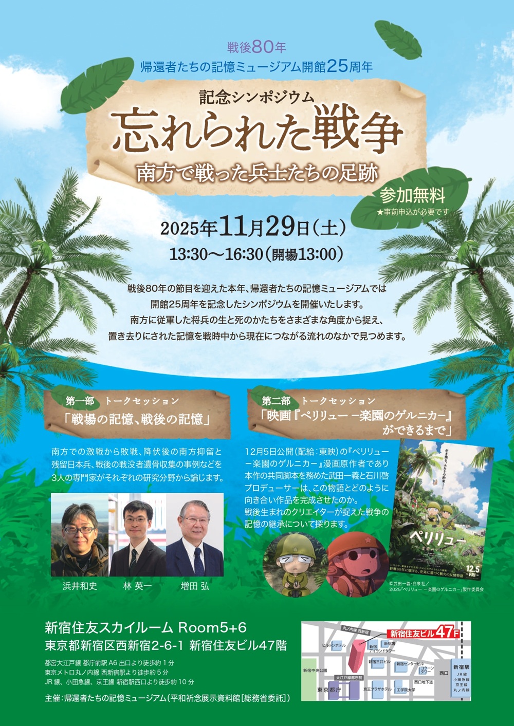 戦後80年の節目を迎えた本年、帰還者たちの記憶ミュージアムでは開館25周年を記念したシンポジウムを開催いたします。南方に従軍した将兵の生と死のかたちをさまざまな角度から捉え、置き去りにされた記憶を戦時中から現在につながる流れの中で見つめます。