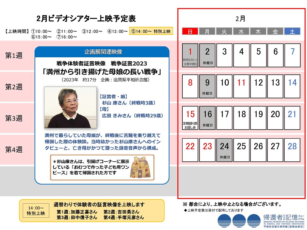 投稿カテゴリー:2025年度(ビデオシアター上映予定) / 2025年度(館からのお知らせ) / トップ表示(館からのお知らせ) / ビデオシアター上映予定 / 館からのお知らせ 帰還者たちの記憶ミュージアム(平和祈念展示資料館)では、兵士、戦後強制抑留者、海外からの引揚者の方々の労苦に関する映像作品や企画展に関連する映像を、ビデオシアターにて上映しています。上映スケジュールは、下図「2月ビデオシアター上映予定表」をご覧ください。ダウンロードもできます。 2月のビデオシアター上映予定表をダウンロードする その他の記事を読む 前の投稿2月の定期語り部お話し会 NEW 次の投稿メールマガジン配信のお知らせ NEW