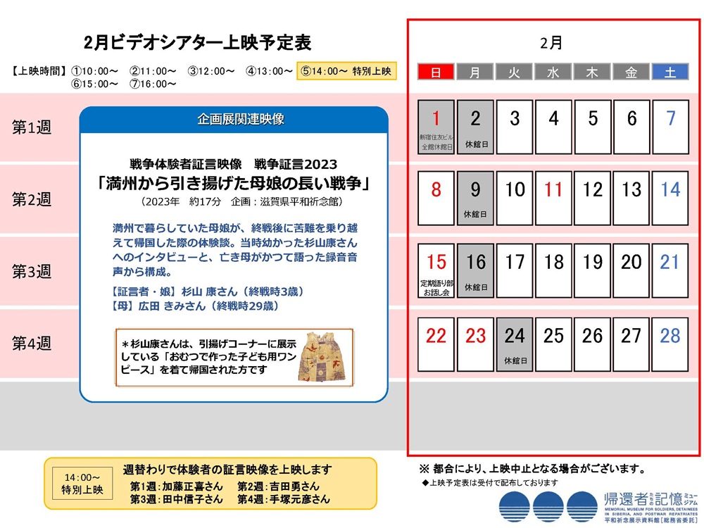 投稿カテゴリー:2025年度(ビデオシアター上映予定) / 2025年度(館からのお知らせ) / トップ表示(館からのお知らせ) / ビデオシアター上映予定 / 館からのお知らせ 帰還者たちの記憶ミュージアム(平和祈念展示資料館)では、兵士、戦後強制抑留者、海外からの引揚者の方々の労苦に関する映像作品や企画展に関連する映像を、ビデオシアターにて上映しています。上映スケジュールは、下図「2月ビデオシアター上映予定表」をご覧ください。ダウンロードもできます。 2月のビデオシアター上映予定表をダウンロードする その他の記事を読む 前の投稿2月の定期語り部お話し会 NEW