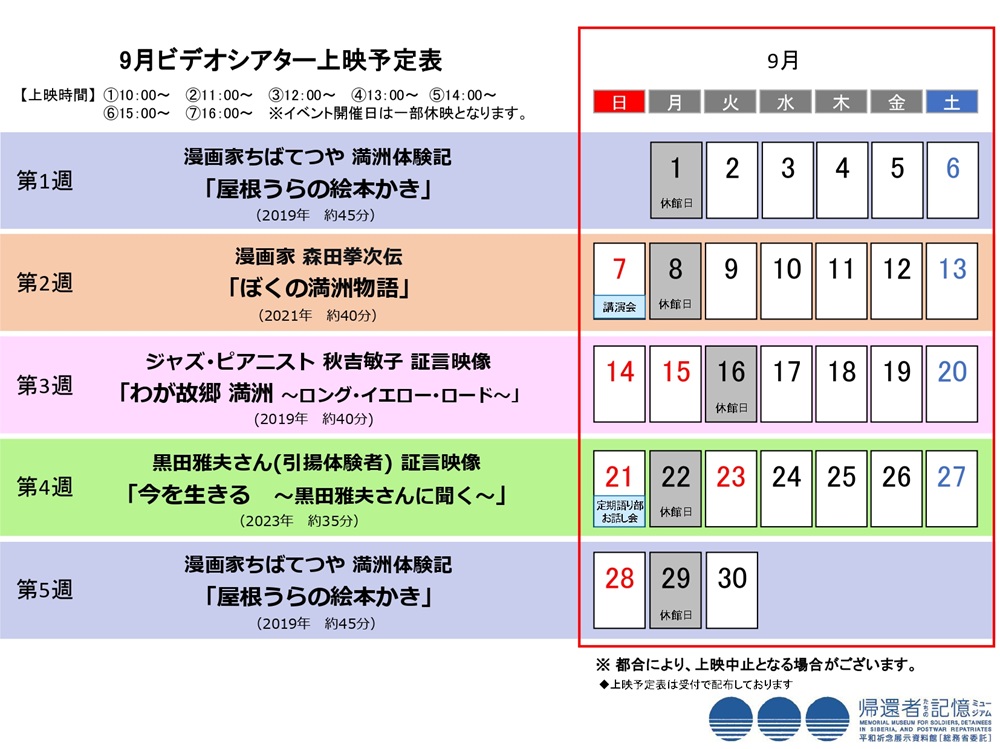 上映スケジュールは、下図「9月ビデオシアター上映予定表」をご覧ください。ダウンロードもできます。