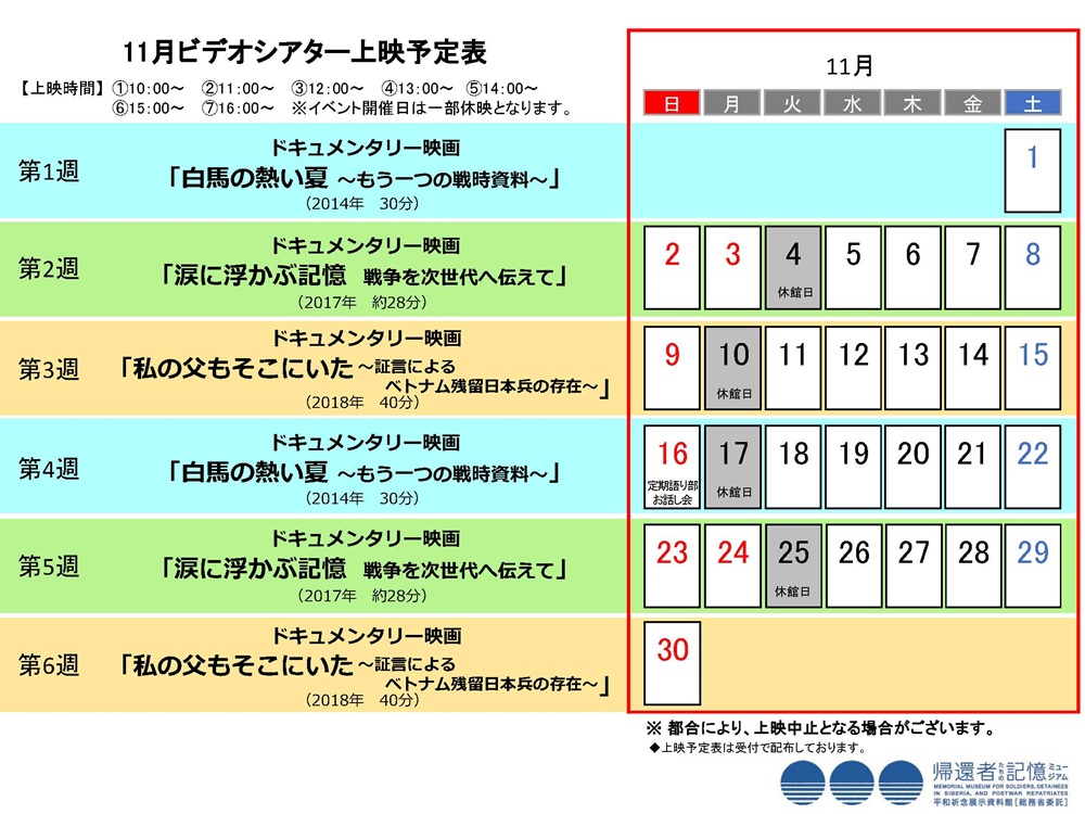 投稿カテゴリー:2025年度(ビデオシアター上映予定) / 2025年度(館からのお知らせ) / トップ表示終了(館からのお知らせ) / ビデオシアター上映予定 / 館からのお知らせ 帰還者たちの記憶ミュージアム(平和祈念展示資料館)では、兵士、戦後強制抑留者、海外からの引揚者の方々の労苦に関する映像作品や企画展に関連する映像を、ビデオシアターにて上映しています。上映スケジュールは、下図「11月ビデオシアター上映予定表」をご覧ください。ダウンロードもできます。 11月のビデオシアター上映予定表をダウンロードする その他の記事を読む 前の投稿11月の定期語り部お話し会 次の投稿メールマガジン配信のお知らせ