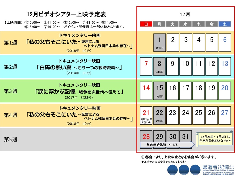 上映スケジュールは、下図「12月ビデオシアター上映予定表」をご覧ください。ダウンロードもできます。