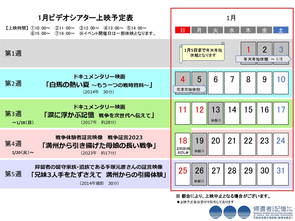 投稿カテゴリー:2025年度(ビデオシアター上映予定) / 2025年度(館からのお知らせ) / トップ表示(館からのお知らせ) / ビデオシアター上映予定 / 館からのお知らせ 帰還者たちの記憶ミュージアム(平和祈念展示資料館)では、兵士、戦後強制抑留者、海外からの引揚者の方々の労苦に関する映像作品や企画展に関連する映像を、ビデオシアターにて上映しています。上映スケジュールは、下図「1月ビデオシアター上映予定表」をご覧ください。ダウンロードもできます。 1月のビデオシアター上映予定表をダウンロードする その他の記事を読む 前の投稿企画展「留守家族たちの肖像 ―抑留に翻弄された人々―」NEW