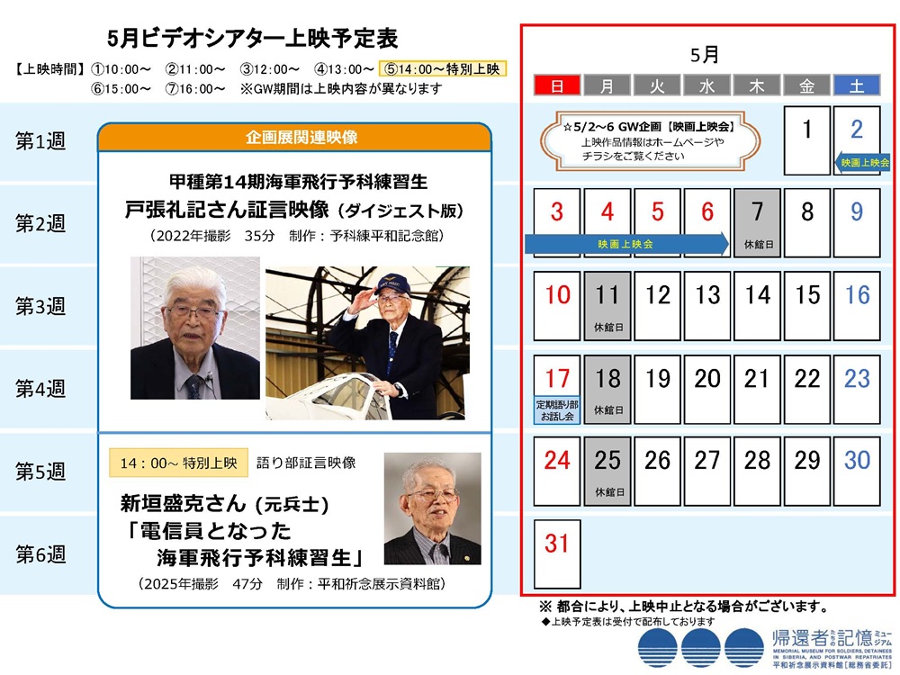 上映スケジュールは、下図「5月ビデオシアター上映予定表」をご覧ください。ダウンロードもできます。